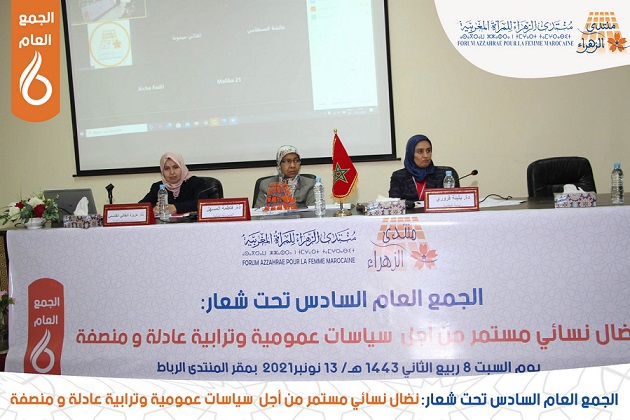 انعقد بحمد الله وتوفيقه الجمع العام السادس لمنتدى الزهراء للمرأة المغربية بالرباط يوم السبت 07 ربيع الثاني 1443 ه الموافق 13 نونبر 2021 م، تحت شعار "نضال نسائي مستمر من أجل سياسات عمومية عادلة ومنصفة"، وقد شكل الجمع العام مناسبة لتقييم أداء المنتدى خلال المرحلة الممتدة من 2017 إلى 2021، وتقديم ومناقشة التقريرين الأدبي والمالي والمصادقة عليهما، بالإضافة إلى المصادقة على تعديل القانون الأساسي وعلى التوجهات الاستراتيجية للمرحلة 2021-2025.